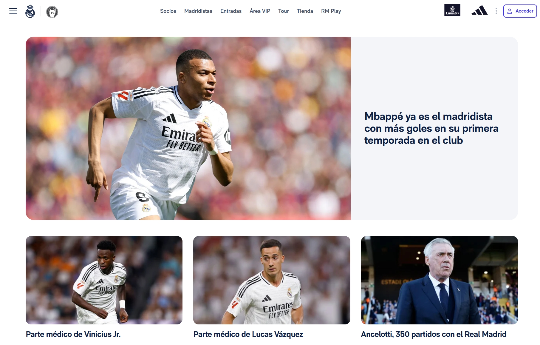 截至本文发出,皇马官网首页的最新动态是维尼修斯和巴斯克斯的两则伤情公告,置顶文章则是介绍姆巴佩39球打破皇马新秀首赛季的纪录。首页有一篇介绍安切洛蒂350场的文章,没有安切洛蒂的离任公告。